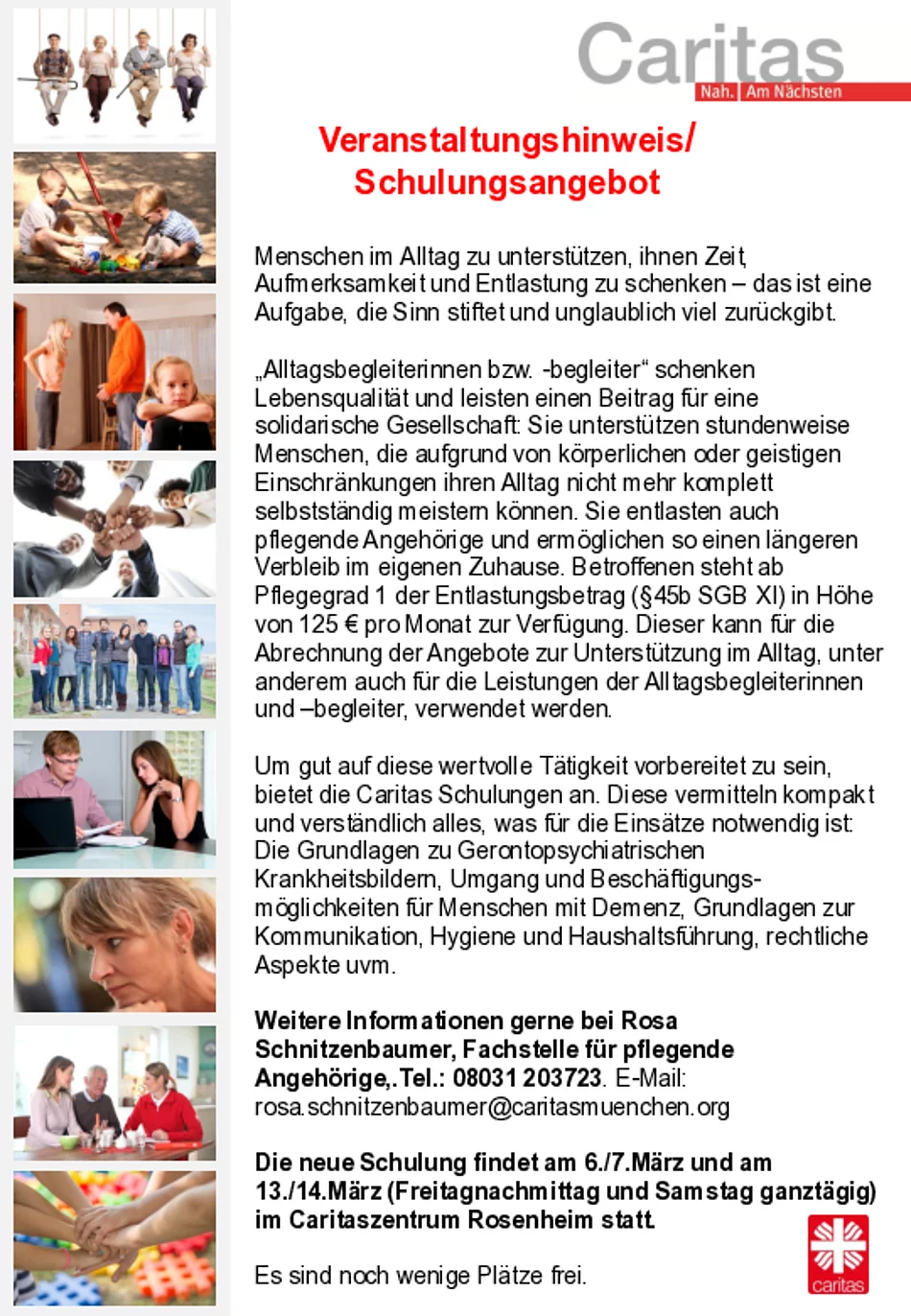 Weitere Informationen gerne bei Rosa Schnitzenbaumer, Fachstelle für pflegende Angehörige (Caritas) in Rosenheim. Telefon: 08031 203723. E-Mail: rosa.schnitzenbaumer@caritasmuenchen.org